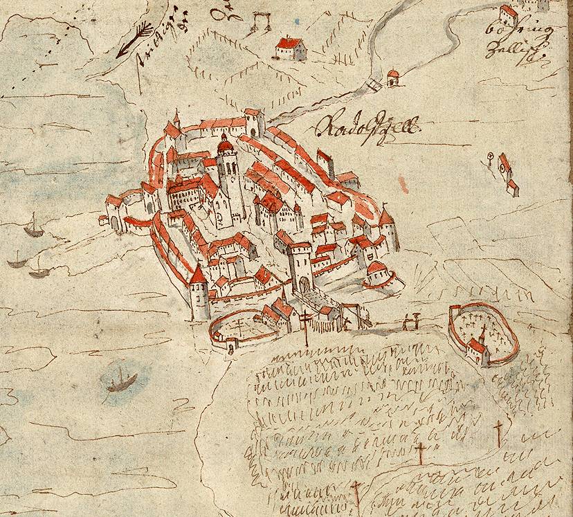 Abb.: Links, vor dem Obertor, ist das erste Kloster abgebildet. Vogelperspektive von Radolfzell, kolorierte Zeichnung, um 1... © Landesarchiv Baden-Württemberg/ GLAK J/B Radolfzell Nr. 2.